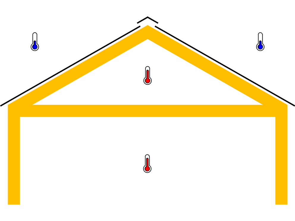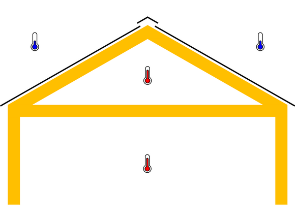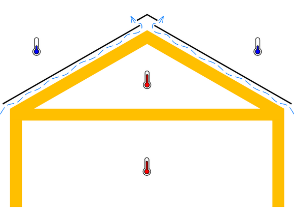 Beim belüfteten (unbeheizten) Dachraum ist die Wärmedämmung im Bereich der obersten Geschossdecke angeordnet. Der darüberliegende Dachraum bleibt ungedämmt und vollständig durchlüftet. Über Öffnungen im Trauf- und Giebelbereich kann Außenluft einströmen und über den First wieder austreten.