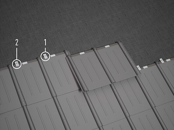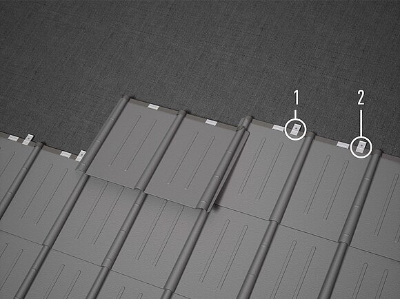 Befestigen Sie jede Platte mit zwei Patenthaften (Standardbefestigung). Die Befestigung der Patenthafte erfolgt mit je einem Rillennagel 2,8/30 oder 2,8/25. Bei Verwendung stärkerer Trennlagen sind gegebenenfalls längere Nägel zu verwenden.