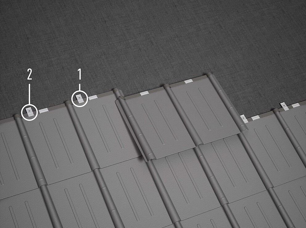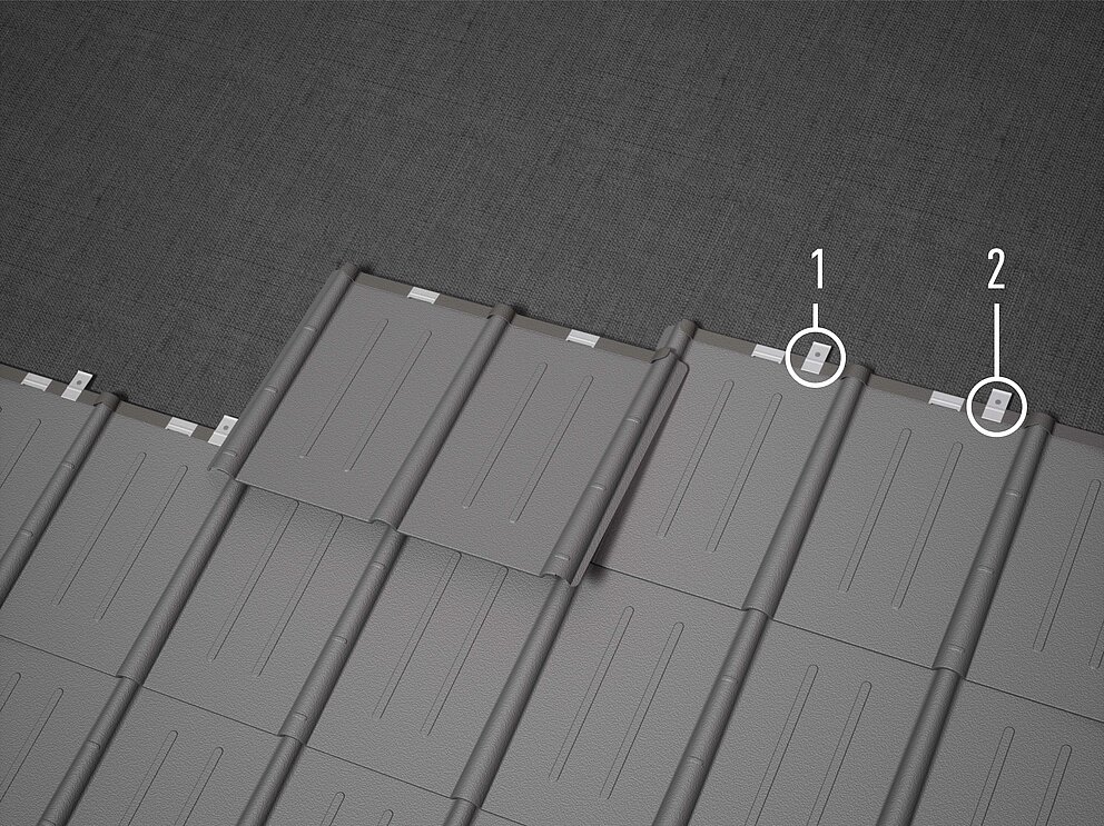 Die Hafte müssen ca. 3 cm neben der Plattenrille gesetzt werden. In besonders sturmgefährdeten Gebieten ist eine Windlastberechnung erforderlich und die Befestigung entsprechend der Berechnung zu erhöhen bzw. geschraubte statt genagelte Befestigung zu verwenden. Ist die Befestigung mit erhöhter Haftanzahl lt. Berechnung nicht ausreichend, kann zusätzlich eine direkte Befestigung seitlich am Wellenauslauf (unterliegende Welle) mit 2 Stk. Halbrundkopf-Schrauben (4 x 25 mm) pro Platte angebracht werden. Die Hafteanordnung ist von der Deckrichtung abhängig. Die Patenthafte für Dachplatten und Dachschindeln sind mit einer zusätzlichen Körnung versehen. Diese Körnung erleichtert das Durchnageln, wenn dies beim vorgegebenen Loch nicht möglich ist (z. B. wegen Astloch, Spalt in der Schalung).