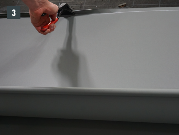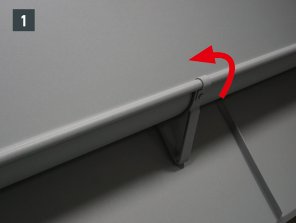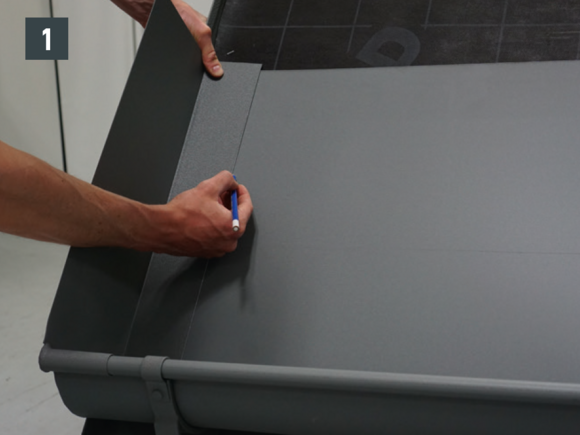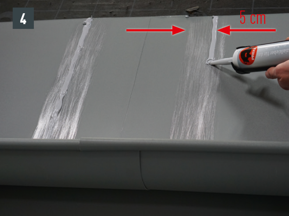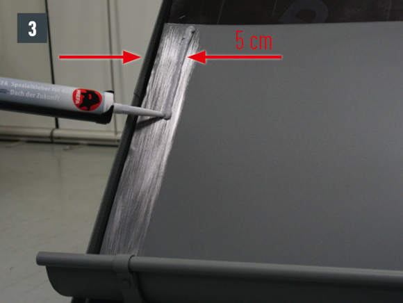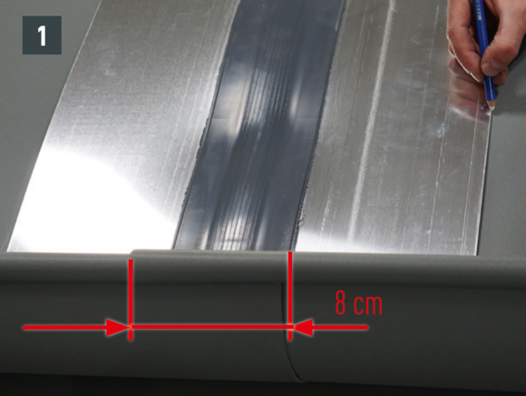 Fälze so weit umlegen, dass die Saumrinne mind. 15 cm auf dem Saumblech aufliegt. Gefälle beachten.