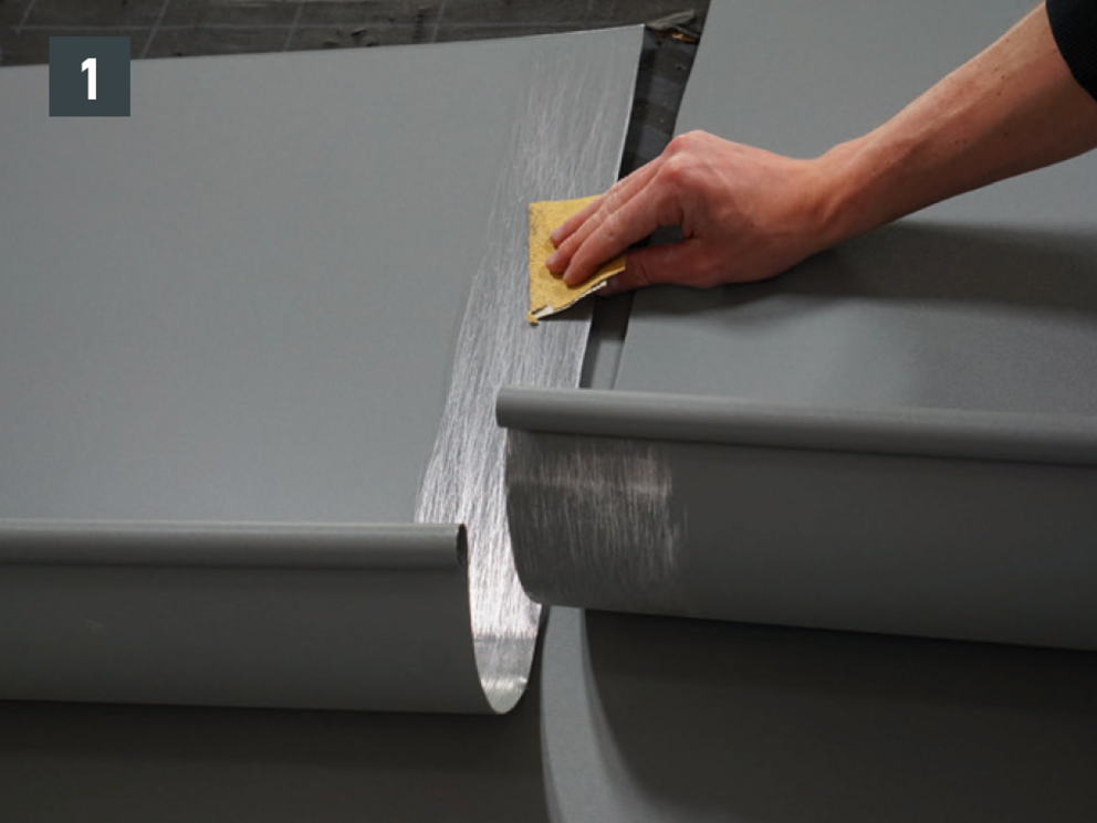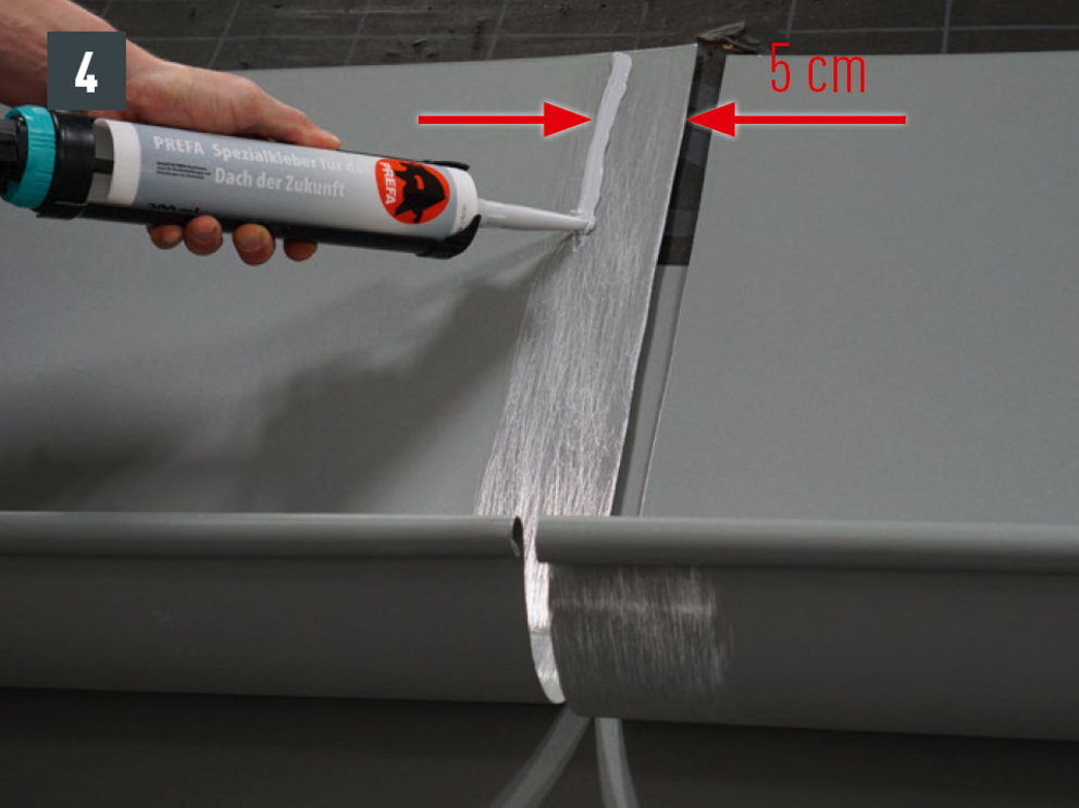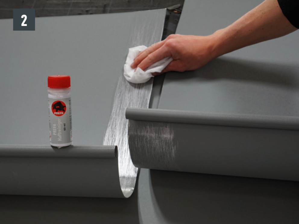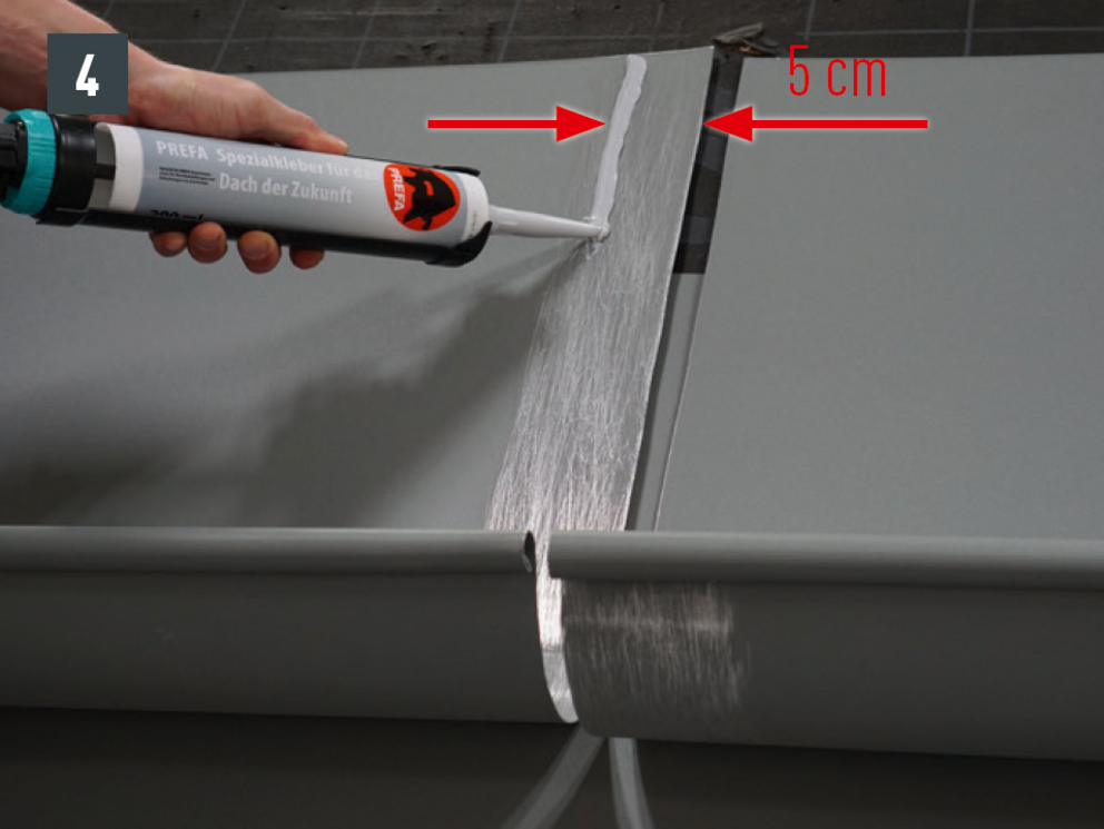 Die Verbindung kann als Klebe- oder Nietverbindung hergestellt werden. Genietete Verbindungen sind zusätzlich mit PREFA Spezialsilikon abzudichten.