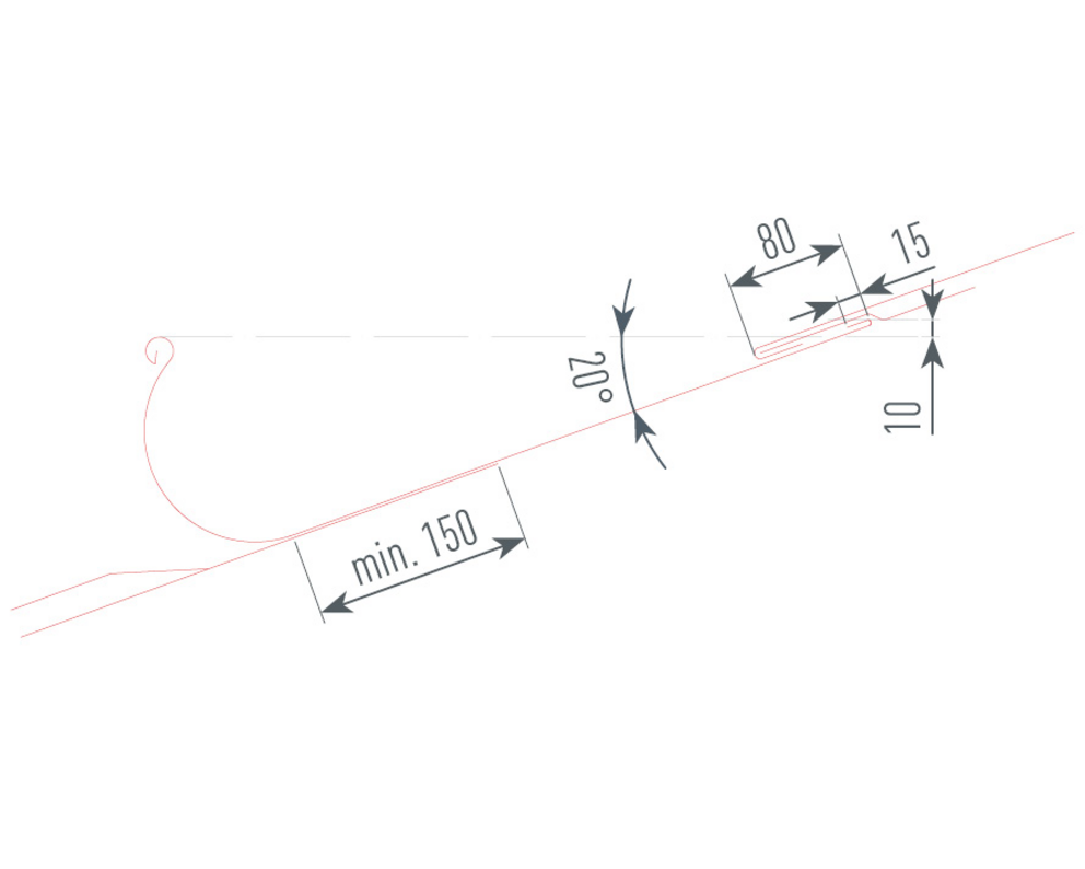 Es ist darauf zu achten, dass die dachseitige Rückkantung um 10 mm höher liegt als die Saumrinnenvorderseite. Daraus ergibt sich bei der PREFA Saumrinne eine Mindestdachneigung von 20° (siehe Abbildung unten).