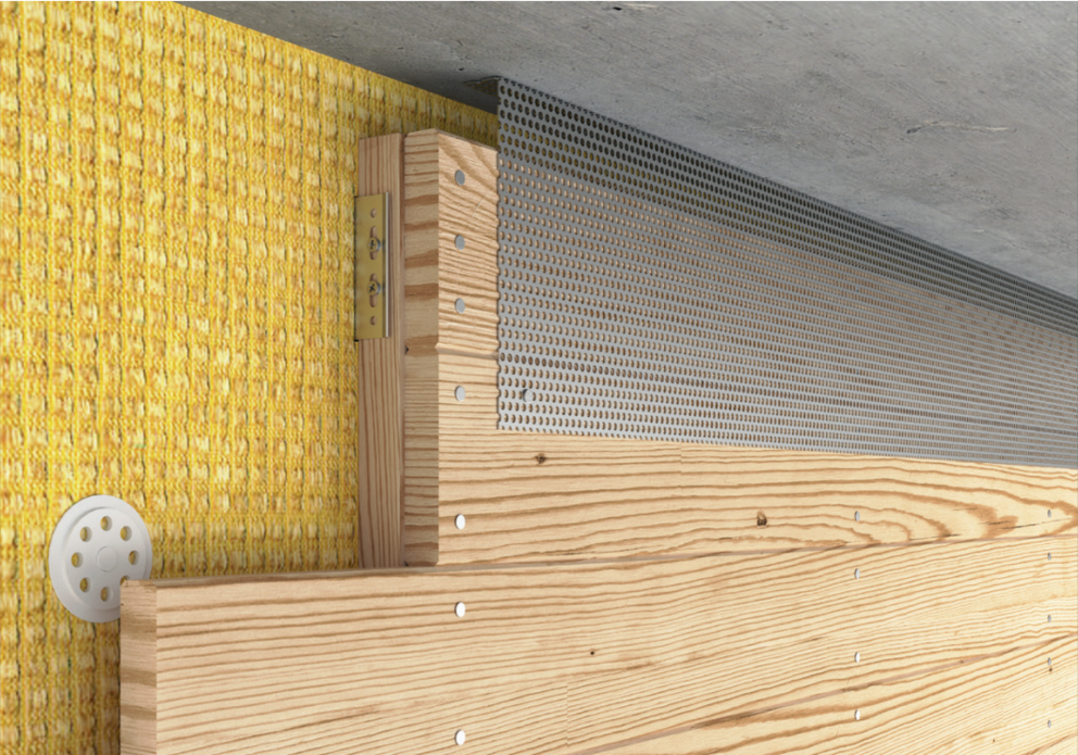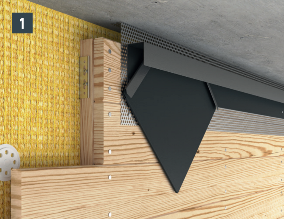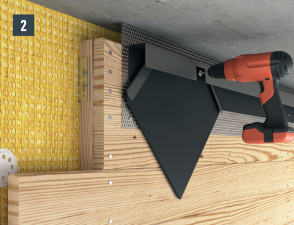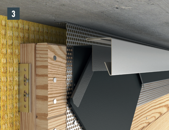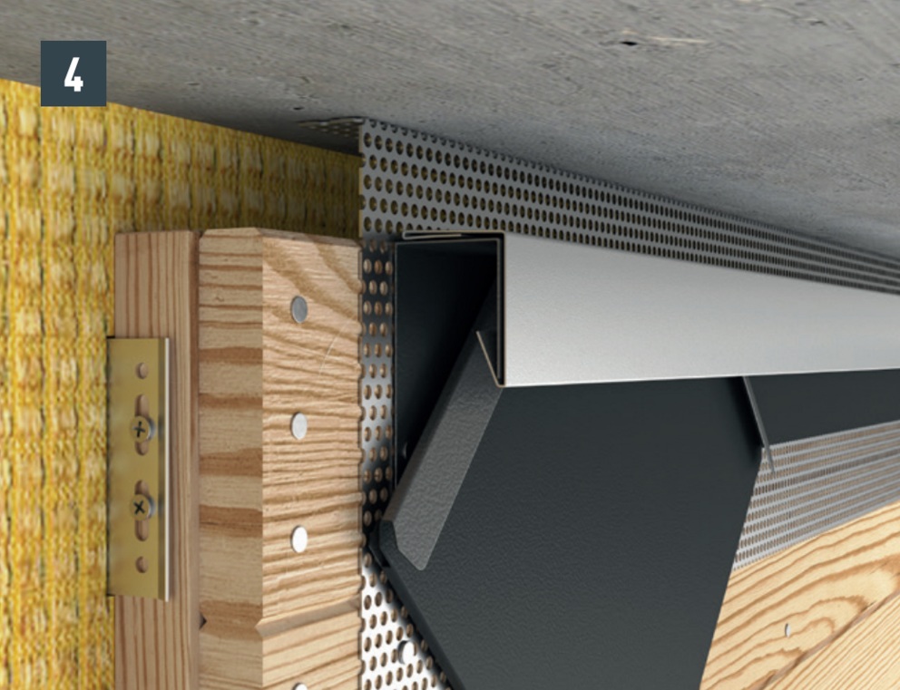 Um die Fassade ordnungsgemäß zu hinterlüften, muss am oberen Abschluss eine Abluftöffnung vorgesehen werden. Montieren Sie bei der Abluftöffnung (z. B. Dachuntersicht) ein Lochblech mit 90° Umbug, um eine höhere Steifigkeit zu erhalten.