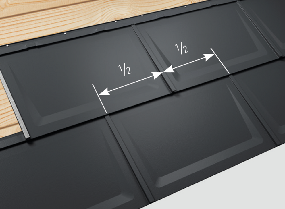 Die Dachplatten R.16 werden immer im Verbund, das heißt stoßversetzt, gedeckt. Um die Verlegung mit halbem Stoßversatz zu erleichtern, ist eine Markierung am oberen Falz der Dachplatte R.16 angebracht.