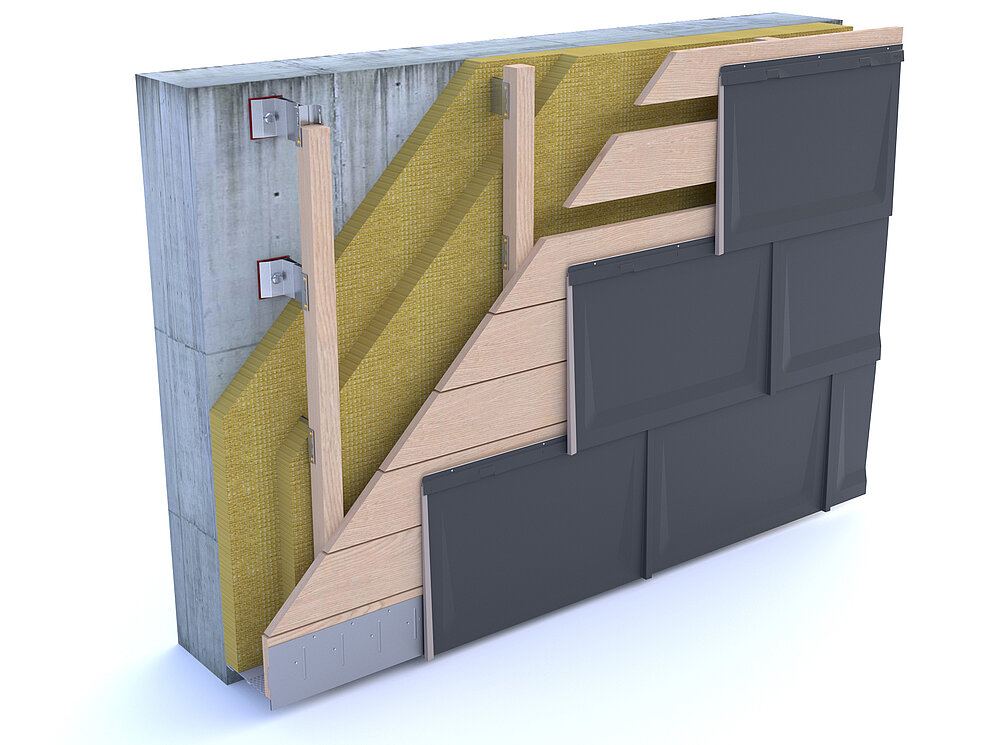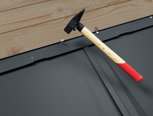 Die Dachplatte R.16 kann auch auf einer Sparschalung (mind. 24 mm) verlegt werden. Achten Sie bei der Verlegung einer Sparschalung darauf, dass sich unter der Befestigungsleiste immer ein Brett befindet und der Lattenabstand von 420 mm eingehalten wird.