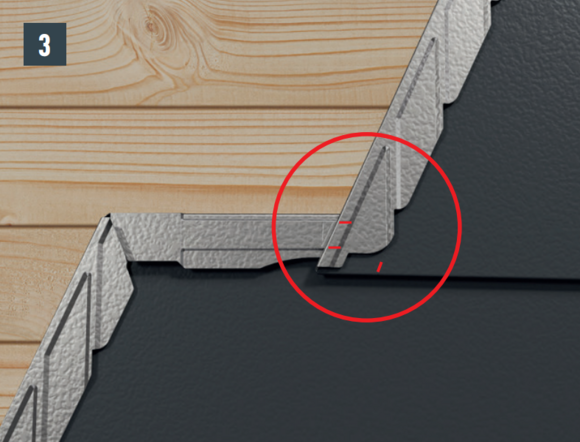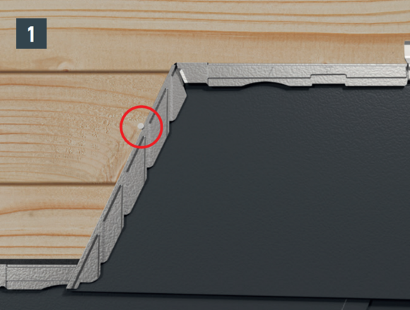 Durch die Form der Dachschindel DS.19 ergibt sich an der Ferse der Dachschindel DS.19 eine Absenkelung. Halten Sie diese Absenkelung auch bei der Verlegung der ersten Dachschindel DS.19 in jeder Reihe ein, indem Sie die erste Dachschindel DS.19 nicht bis ganz nach oben in den Saumstreifen bzw. Falz hochschieben. Lassen Sie die Ferse der ersten Dachschindel DS.19 so weit nach, bis der obere Schindelumschlag über die gesamte Länge gerade durchläuft. Ein Überziehen der ersten Dachschindel DS.19 muss vermieden werden.