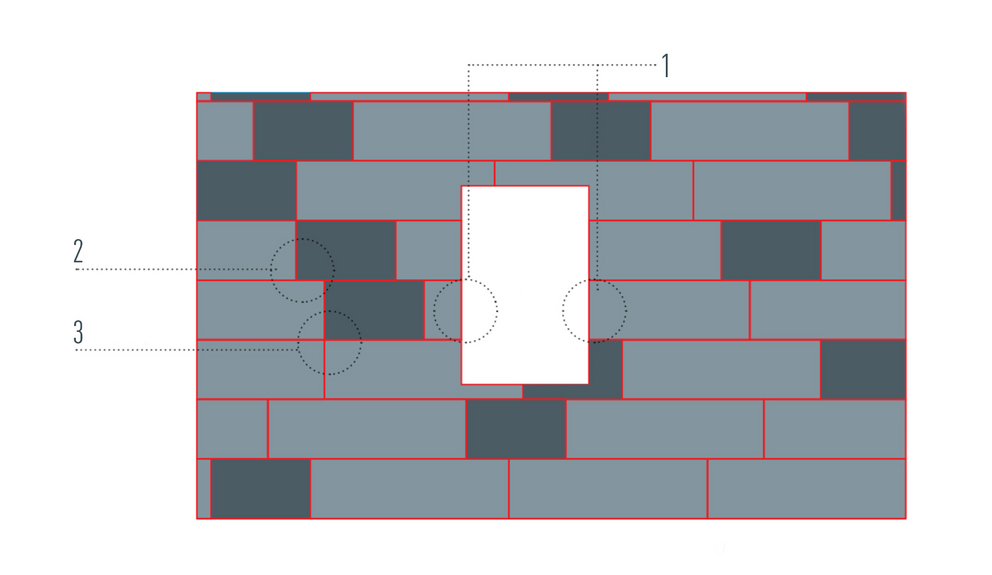 Ein abgeschnittenes FX.12-Paneel wurde an der anderen Seite der Öffnung weiterverwendet (1). Somit ist eine korrekte Stoßverteilung nicht mehr gewährleistet (2) und kann im schlimmsten Fall zu einer Überlappung der Stöße führen (3). Deshalb wurden Verlegebeispiele für einen optimalen Stoßversatz erstellt.