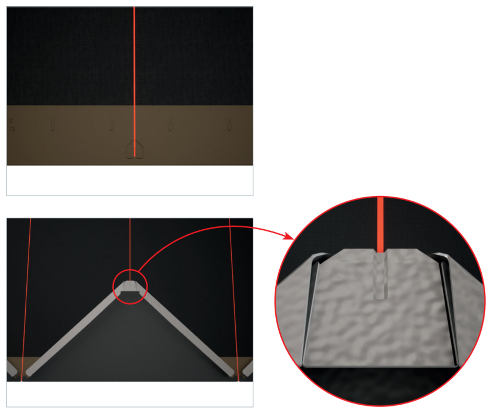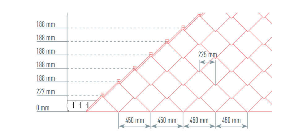 Zur Hilfestellung bei der Verlegung der PREFA Wandrauten 29 × 29 empfiehlt es sich, einen Raster aus senkrechten Schnurschlägen im Abstand von 450 mm herzustellen (als Hilfestellung dienen die Markierungen im Saumstreifen). Um das Schnürmaß in jeder Reihe genau einzuhalten, kann bei Bedarf auch das halbe Schnürmaß angezeichnet und in regelmäßigen Abständen geprüft werden. Richten Sie die Startplatten mit den Kerben (an der Oberkante der Startplatten) an den senkrechten Schnurschlägen aus (siehe Abbildung unten). Hierbei ist zu beachten, dass der Bereich für die seitliche Aufkantung (z. B. seitlicher Abschluss bzw. Gebäudeecken) nicht mittig in den Wandrauten 29 × 29 liegt (Symmetrie Fassadenfläche beachten).