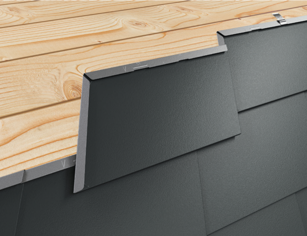 Durch die Form der Wandschindel ergibt sich an der Ferse der Wandschindel eine Absenkelung. Halten Sie diese Absenkelung auch bei der Verlegung der ersten Wandschindel in jeder Reihe ein, indem Sie die erste Wandschindel nicht bis ganz nach oben in den Saumstreifen bzw. Falz hochschieben. Lassen Sie die Ferse der ersten Wandschindel so weit nach, bis der obere Plattenumschlag über die gesamte Länge gerade durchläuft. Ein Überziehen der ersten Wandschindel muss vermieden werden. Stellen Sie sicher, dass beim Anschluss an die Kehle der obere Plattenumschlag über die gesamte Länge gerade durchläuft.