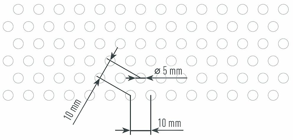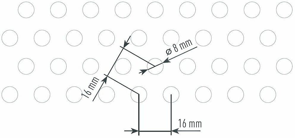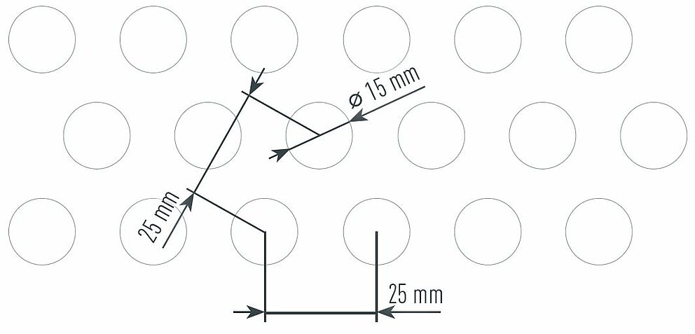 Perforierte PREFABOND Verbundplatten verfügen über ein gleichmäßiges Lochmuster. Aufgrund der Mineralstruktur des Kerns wird eine Perforierung mit Stanzmaschinen für die PREFABOND mit A2-Kern nicht empfohlen.