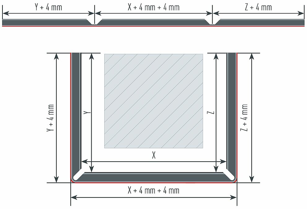 Bei einer U-Kantung mit zwei Außenecken wird jede Ecke einzeln betrachtet. Um die korrekte Fräsachse zu erreichen, muss jedem Schenkel die Materialstärke (4 mm) hinzugefügt werden.