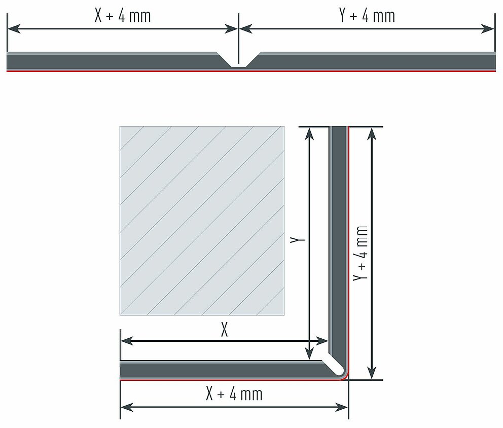 Bei einer Außenecke ist die Materialstärke der Verbundplatte (4 mm) den gemessenen Naturmaßen hinzuzufügen.