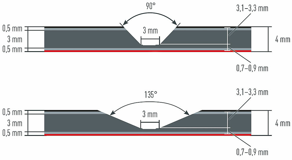 Die für eine Abkantung erforderliche V-Nut wird, unabhängig ob Innen- oder Außenecke, immer auf der Plattenrückseite gefräst. Eine korrekte V-Nut-Fräsung ist so auszuführen, dass einerseits 0,5 mm des Deckbleches (lackierte Sichtseite) und andererseits beim Kern weitere 0,2 bis 0,4 mm (FR-Kern) resp. weitere 0,15 bis 0,25 mm (A2-Kern) erhalten bleiben.