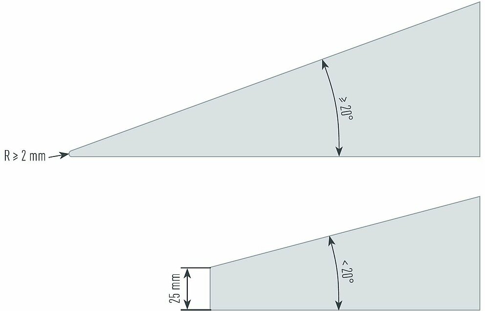 Beachten Sie die Mindestabmessungen und -winkel, die materialtechnisch möglich sind. Spitze Winkel können ab einer Winkelöffnung von 20° gefertigt werden. Liegt die Winkelöffnung unter 20°, muss die Spitze des Winkels mit einem Steg von mindestens 25 mm beendet werden.