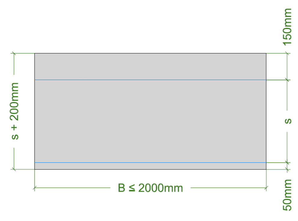 Bedingt durch das Biegen mit Walzen haben die Platten einen Auslauf mit einer kleinen Druckstelle, die durch PREFA zurückgeschnitten wird. Beachten Sie die Abmessungen des Rohmaterials! Der Zuschnitt ist nämlich an den Plattenenden um 200 mm größer als das effektiv benötigte Bogenmaß. Zum Bogenmaß (s) werden an einem Ende 150 mm und am anderen 50 mm addiert.