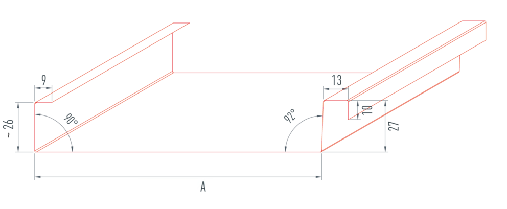 Die einzuhaltenden Winkel und Abmessungen des Profils sind in der Abbildung unten dargestellt und müssen unbedingt eingehalten werden. Veränderungen der Profilabmessungen können zum Aufwölben der Scharen und zu einer fehlerhaften Verlegung führen!
