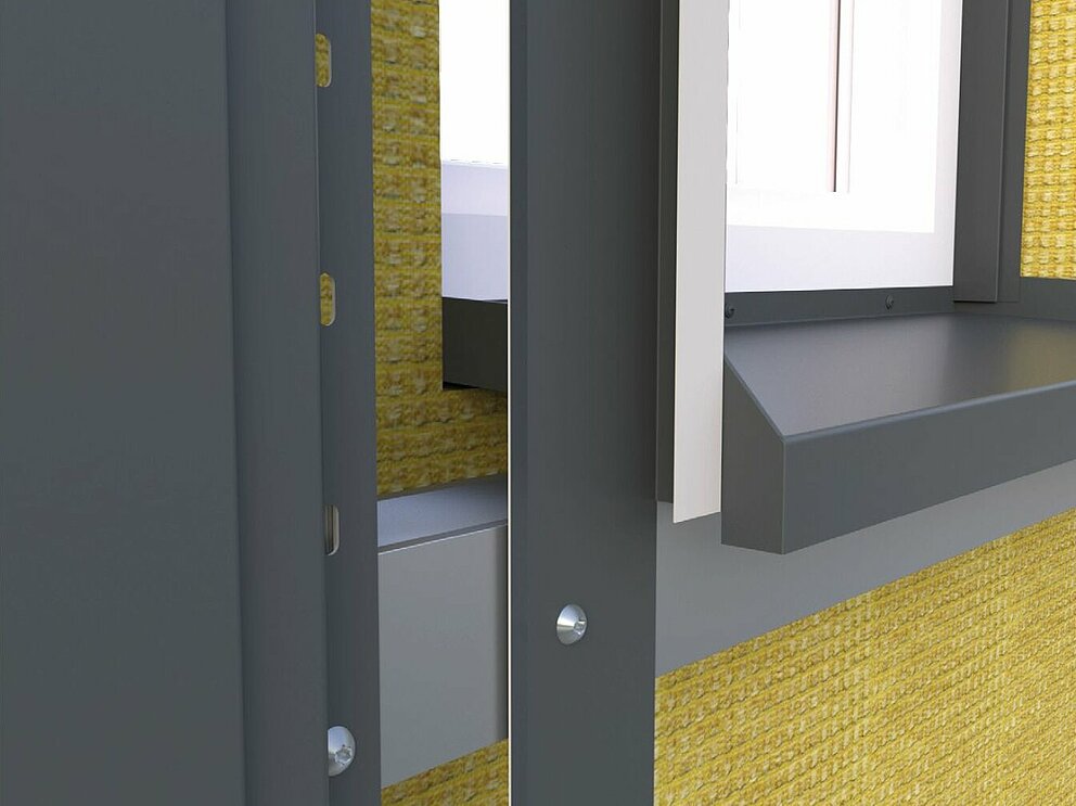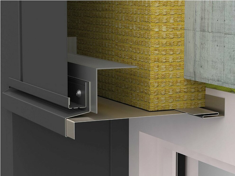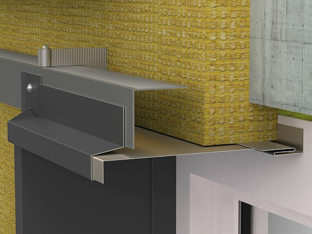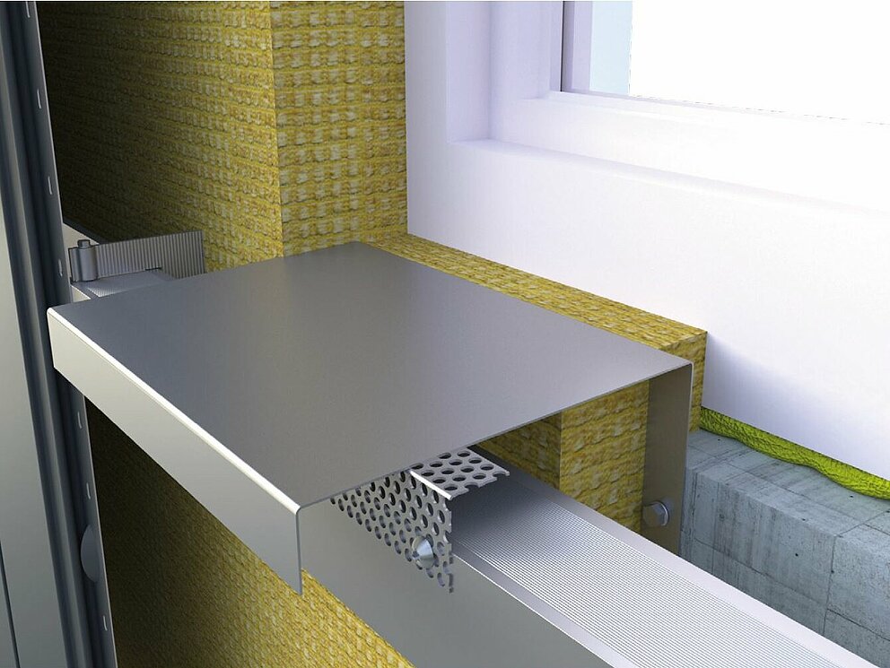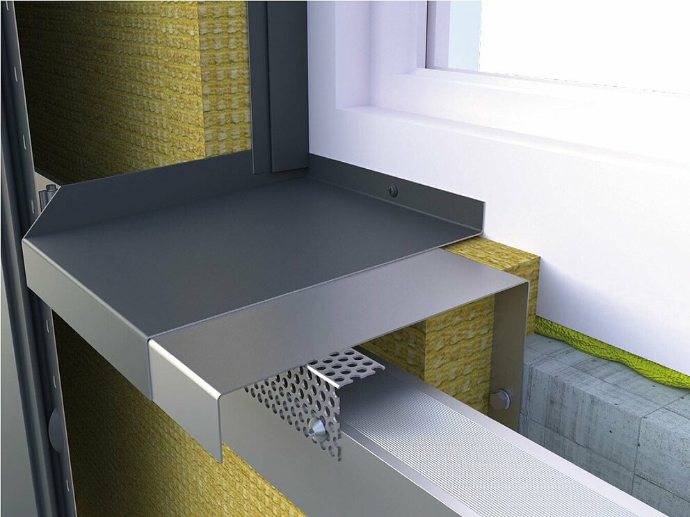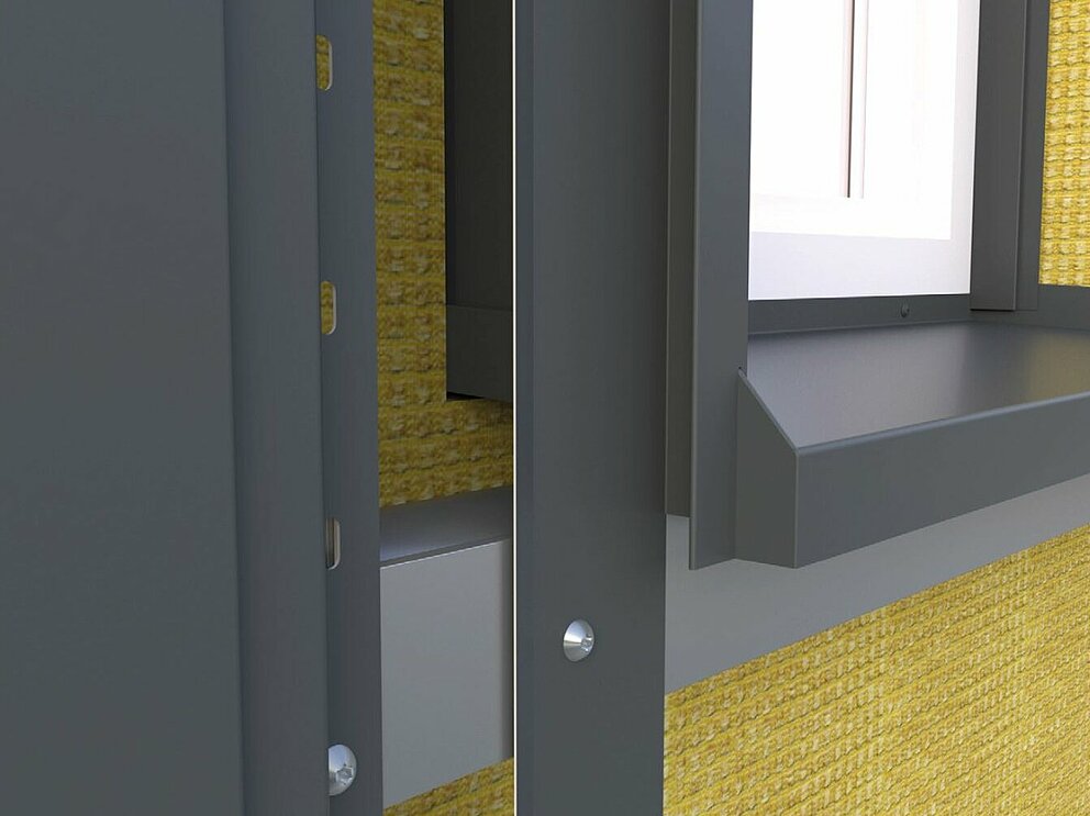 Im ersten Schritt der Fenstereinfassung erfolgt die Montage von Lochblech und Haltestreifen. Stellen Sie sicher, dass die Abluftöffnung der Hinterlüftungsebene nicht behindert wird.