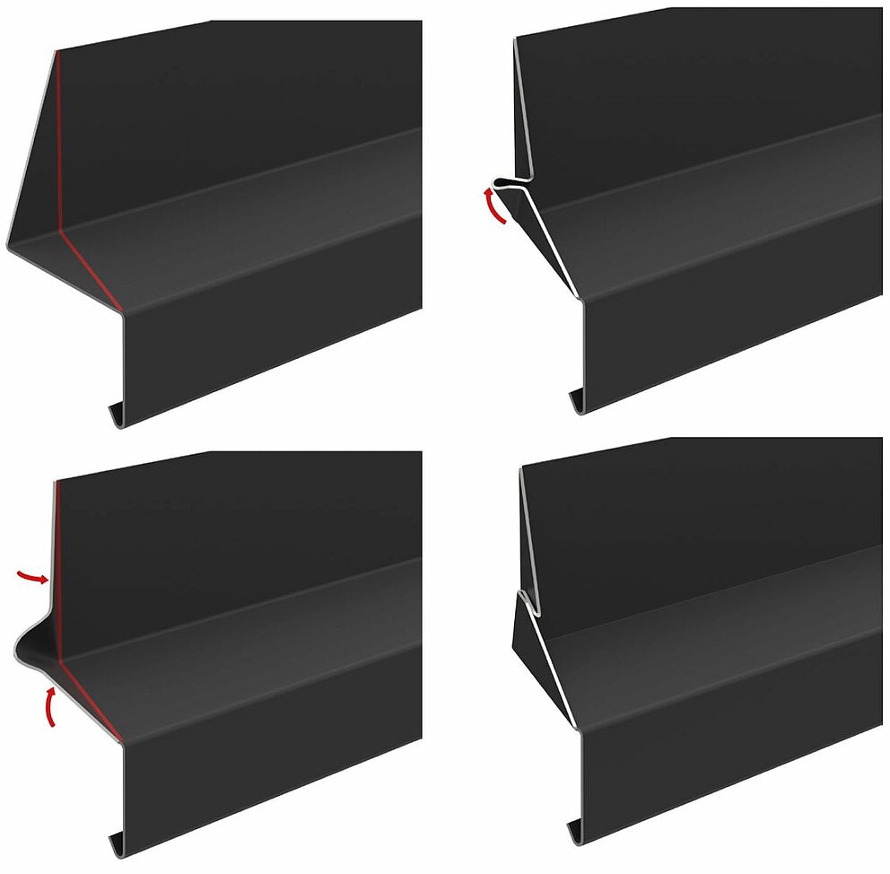 Um die Steifigkeit des Sidings zu erhöhen, empfiehlt es sich, eine Umkantung bzw. eine Anreifung herzustellen. Achten Sie dabei auf eine ausreichende Zuluftöffnung.