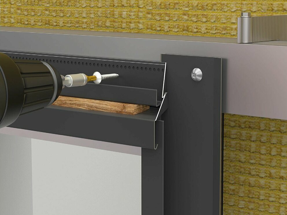 Der Wetterschenkel wird gemeinsam mit der Schnittlochblende an die Unterkonstruktion montiert. Achten Sie darauf, dass zwischen Wetterschenkel und Schnittlochblende für die optimale Zuluftöffnung ein Abstand von 10 mm eingehalten wird. Um eine exakte Parallele zu erhalten, empfiehlt sich die Verwendung einer Lehre.