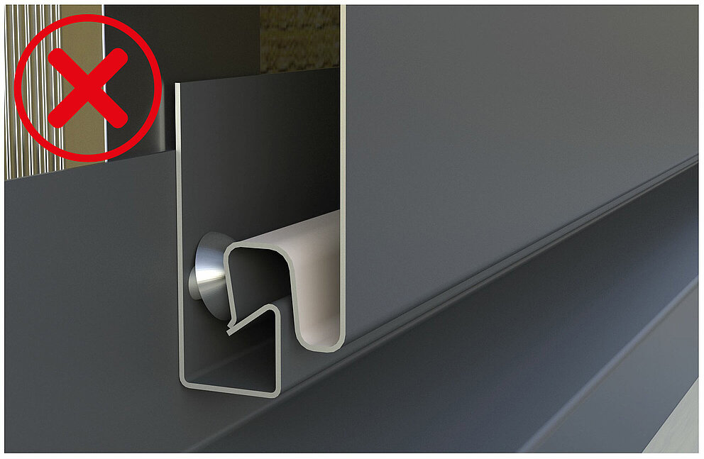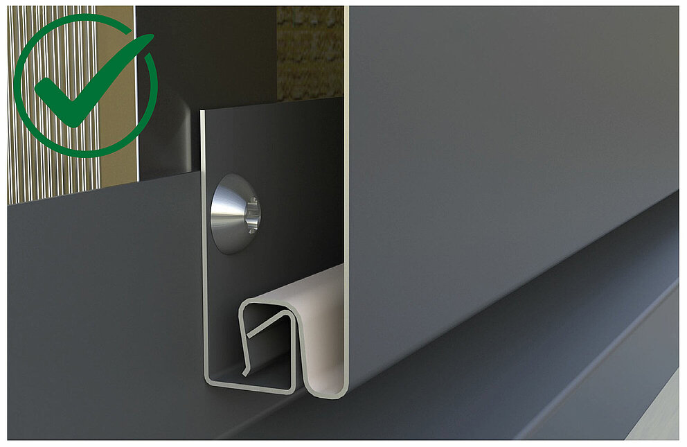Bevor Sie Siding, Siding.X und Siding Perforiert in das Startprofil oder die Schnittlochblende stecken, entfernen Sie sämtliche Metallspäne und Verschmutzungen, sodass der verdeckte Nut-/Feder-Verschluss zwängungsfrei ineinandergreifen kann.