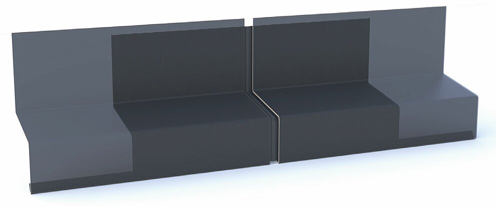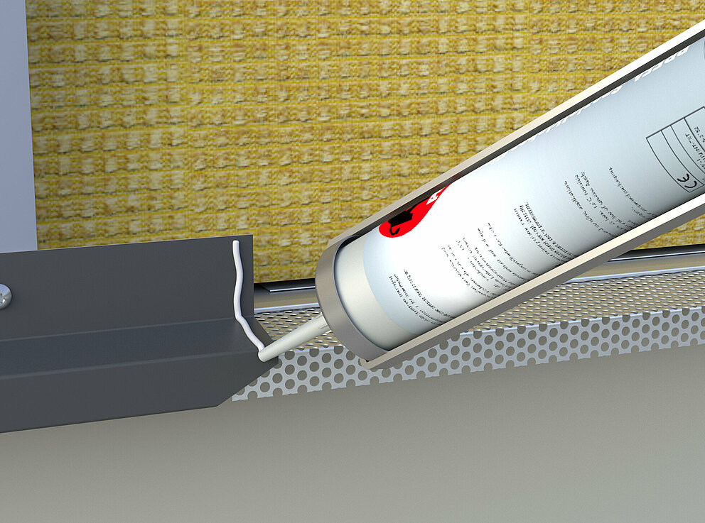 Beginnen Sie nach der fertig errichteten Unterkonstruktion mit der Montage von Steckleiste, Abdeckstreifen, Lochblech und Wetterschenkel. Die Stoßausbildung des Wetterschenkels erfolgt überlappend und geklebt. Der (verdeckt) darunterliegende Wetterschenkel wird eingeschnitten, sodass der darüberliegende Wetterschenkel montiert werden kann.
