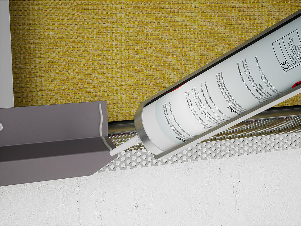 Beginnen Sie nach der fertig errichteten Unterkonstruktion mit der Montage von Steckleiste, Abdeckstreifen, Lochblech und Wetterschenkel. Die Stoßausbildung des Wetterschenkels erfolgt überlappend und geklebt. Der (verdeckt) darunterliegende Wetterschenkel wird eingeschnitten, sodass der darüberliegende Wetterschenkel montiert werden kann.