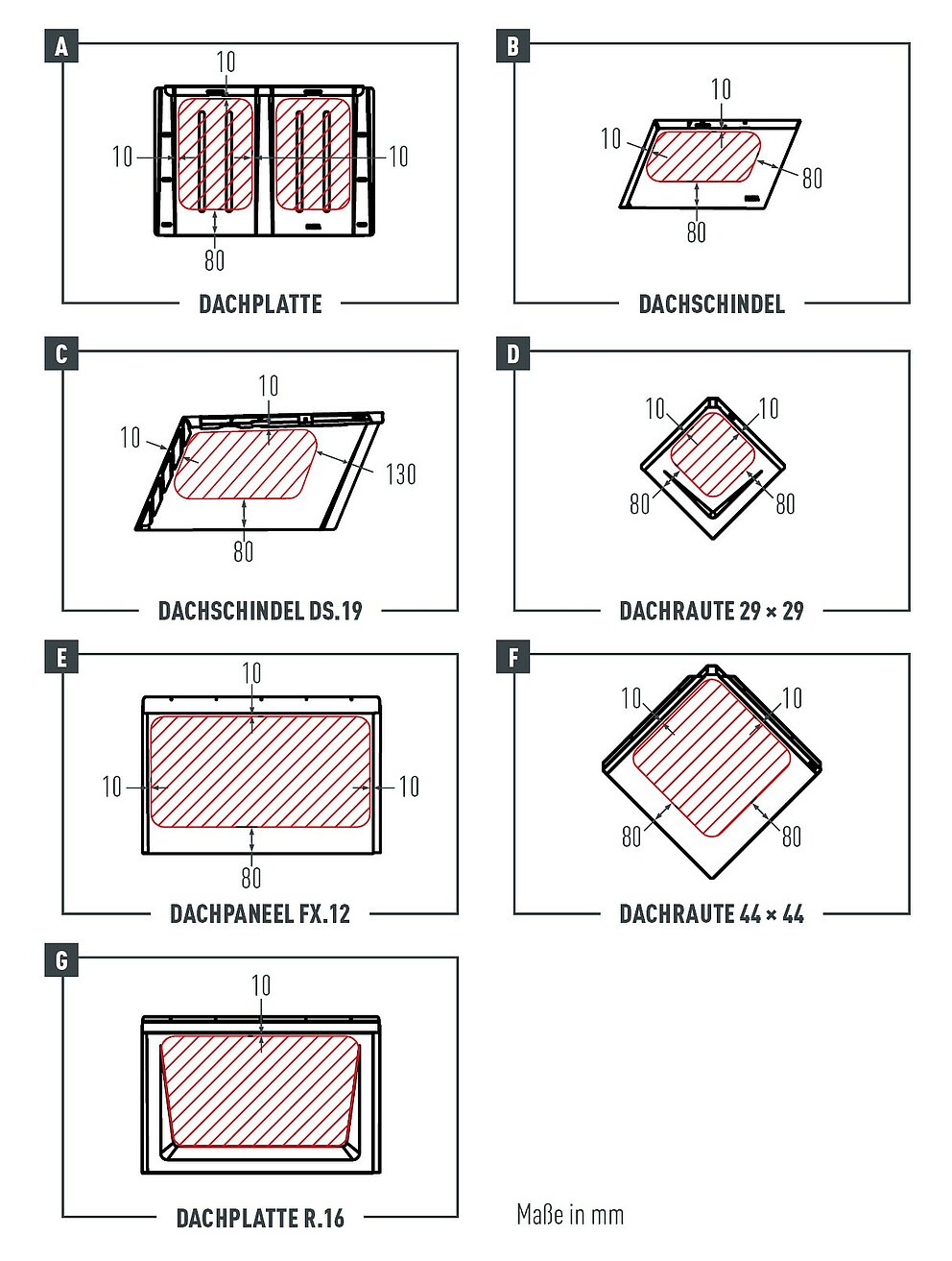 Problemlose Montage und sicherer Halt auf Dachplatte, Dachplatte R.16, Dachschindel, Dachschindel DS.19, Dachraute 29×29, Dachraute 44×44 und Dachpaneel FX.12. Im Bereich des PREVARIO 3.S muss eine Vollschalung aufgebracht sein.