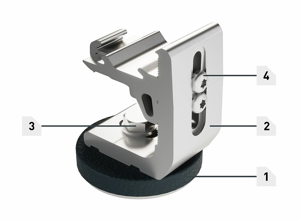 Für die Befestigung am Sparren müssen die Bohrlöcher (⌀ 8,5 mm) in der Achse des Sparrenverlaufs liegen (Befestigungsschrauben in einer Achse mit dem Sparren). Rückseitige Schutzfolie am Fußteil abziehen, positionieren und aufkleben.