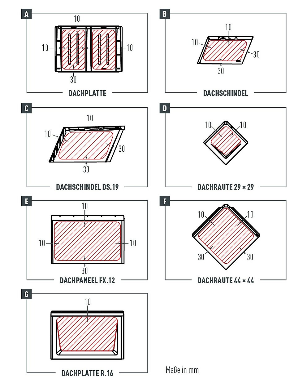 Wie in voriger Abbildung ersichtlich, ist der Montagebereich des PREVARIO Sunny bei den kleinformatigen PREFA Produkten begrenzt. Die Montage des Sunny erfolgt ausschließlich auf den geraden Flächen. Da der Sunny lediglich abdichtende Aufgaben erfüllt, kann mit der Abdeckkappe näher an die Falze herangerückt werden.