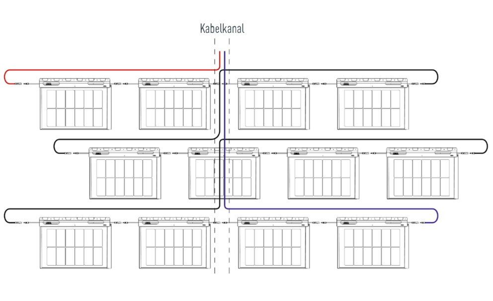 Eine PREFA Solardachplatten-Anlage benötigt je Strang eine Zu- und eine Ableitung. Darüber hinaus müssen die Dachplattenreihen untereinander mit sogenannten Verbindungsleitungen verbunden werden.