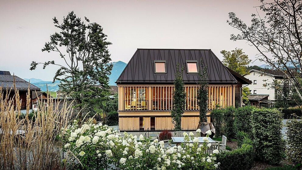 Ziel der Architektinnen war, die Gebäude-Trilogie des Hotels harmonisch zu vollenden. Als drittes Gebäude sollte das „Badehaus“ mit Tradition, Topografie und Areal stimmig korrespondieren und die Charakteristik des Bregenzerwälderhauses innovativ adaptieren. Wohlwissend um die prominente Sichtbarkeit des Daches im historischen Dorfzentrum entwickelte NONA seine eigene Vision: „Wir wollten unbedingt dieses Dach für das Gebäude“, so Architektin Anja Innauer über ihr Konzept eines 60-Grad-geneigten PREFA Stehfalzdaches mit atypisch verlaufenden Stehfalzen, die teils schräg über die Dachfläche verlaufen. Eine gewagte Idee, die zunächst auf Skepsis stieß. Doch die Architektinnen konnten gemeinsam mit ihren Bauleitern Flatz & Jäger die Bauherren, Anwohner und Handwerker im offenen Dialog von ihrer mutigen Neuinterpretation traditioneller Formensprache begeistern.