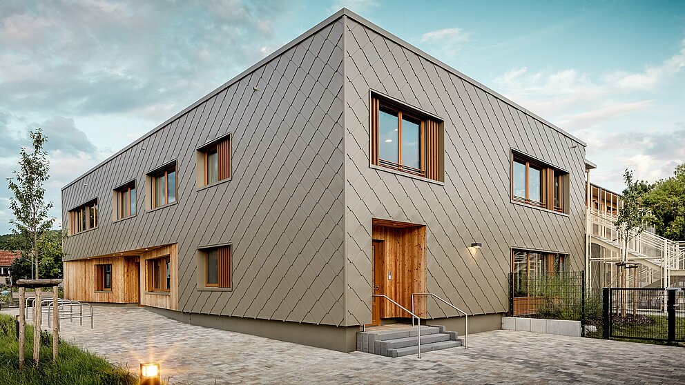 Den bronzefarbenen Aluminiummantel legte die Spenglerei ASA Schüßler um das Gebäude. Das fränkische Traditionsunternehmen hat bereits das zweite PREFARENZEN Projekt in Alzenau erfolgreich umgesetzt. Für das Hybridgebäude wurden etwa 3.500 der 44 × 44 Zentimeter großen PREFA Wandrauten in Bronze montiert – jede einzeln verdeckt mit PREFA Rillennägeln auf die hölzerne Vollschalung angebracht. Die zahlreichen Gebäudeecken und Leibungen sind mit Taschenprofilen und Standard-Eckwinkeln besetzt.