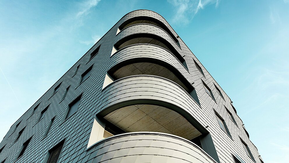 Der Neubau kombiniert solide Massivbauweise mit außergewöhnlicher Optik. Was zum einen an der kantenlos dreieckigen Gebäudeform liegt. Andererseits ist seine „schuppige Reptilienhaut“ aus kleinteiligen PREFA Wandschindeln in P.10 Hellgrau als gleichmäßig umlaufende Metallfassade ein echter Eyecatcher. Noch dazu eine gute Wahl, denn dank ihres Formats lassen sich die Wandschindeln auch im engen Radius verlegen und ermöglichen so die abgerundeten Ecken. „Direkt hinter unserem Gebäude beginnen traditionelle Schweizer Einfamilienhäuser und die sind bei uns geschindelt“, begründet Keller seine kreative Design-Entscheidung.