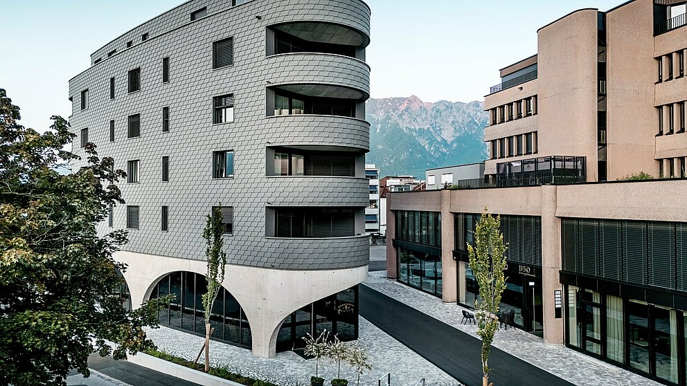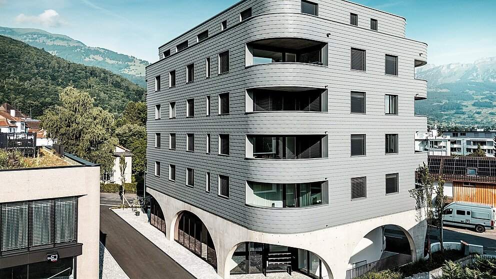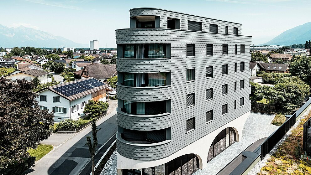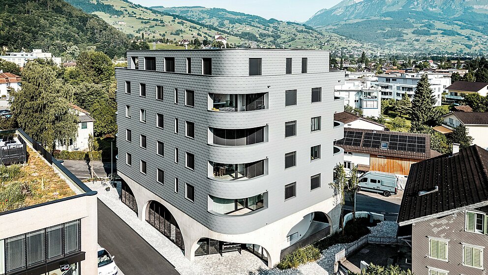 „Architektonisch ansprechend, technisch eine große Herausforderung“, so Gabriel Landolt von Künzli Davos. Das Schweizer Traditionsunternehmen realisierte die schuppenartige Fassade und setzt seit Jahren auf die Qualität von PREFA: „Zum einen ist das Material sehr leicht und gleichzeitig witterungsbeständig. Optisch lässt sich eine homogene Oberfläche schaffen, die stilistisch zeitlos und besonders langlebig ist. Wie alle PREFA Produkte sind auch die in Buchs verwendeten Wandschindeln wartungsarm. Und das Aluminium lässt sich als Sekundärrohstoff nachhaltig recyceln.“