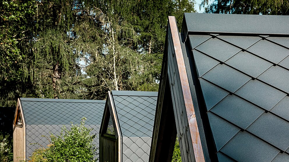Für die Dächer und Fassaden wurden PREFA Aluminiumrauten in der Farbe P.10 Anthrazit verwendet. Durch seine Struktur erinnert die Gebäudehülle an die Haut von Fischen in einem Koi-Teich. Die filigranen, kleinformatigen Rauten sorgen nicht nur für eine unverwechselbare Optik, sondern auch für eine hohe Funktionalität. Das Material ist widerstandsfähig und langlebig, was es ideal für die harschen Bedingungen in den Tiroler Bergen macht.